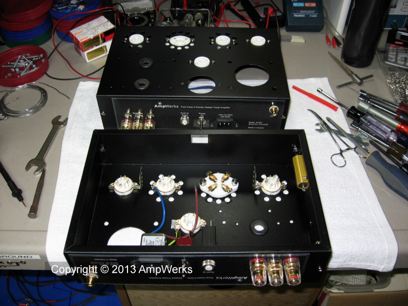 The 300B, 5U4 and most directly heated (DH) tubes are designed to operate base down, or in a specified safe orientation. The filament expands when hot to the point where it can droop and touch other internal tube elements if the tube is not in a safe position. According to the tube manual each of our DH tubes does have a safe horizontal orientation, but with our chassis layout they are at odds, so to be safe I keep the amps upright when powered up.