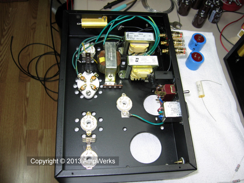 We used existing component leads where possible and teflon insulated hookup wire where required. The ground bus is 14 ga. bare solid copper wire.