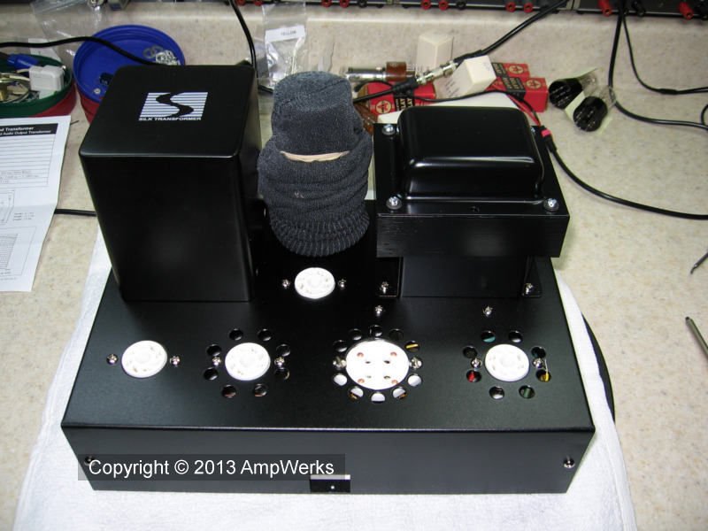 Tube sockets are next. I used ceramic sockets with gold plated pins for all of the tubes. The 4-pin sockets for the 300B output tubes are shock mounted with rubber o-rings. 300Bs can be somewhat microphonic.