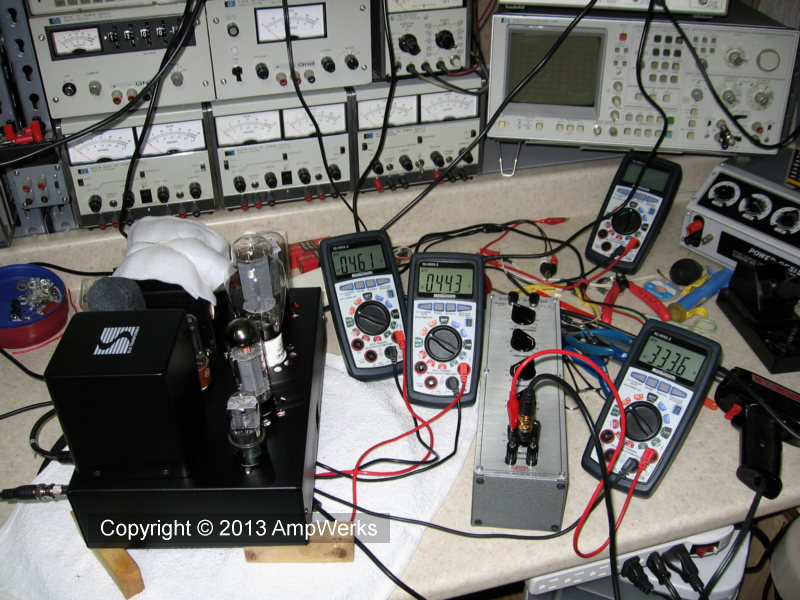 The amp is up on blocks to keep it vertical while accommodating the meter leads that connect to test points beneath the chassis. The decade resistance box indicates that I was tweaking something at the time. I think it was the B+ dropping resistor for the input stage.