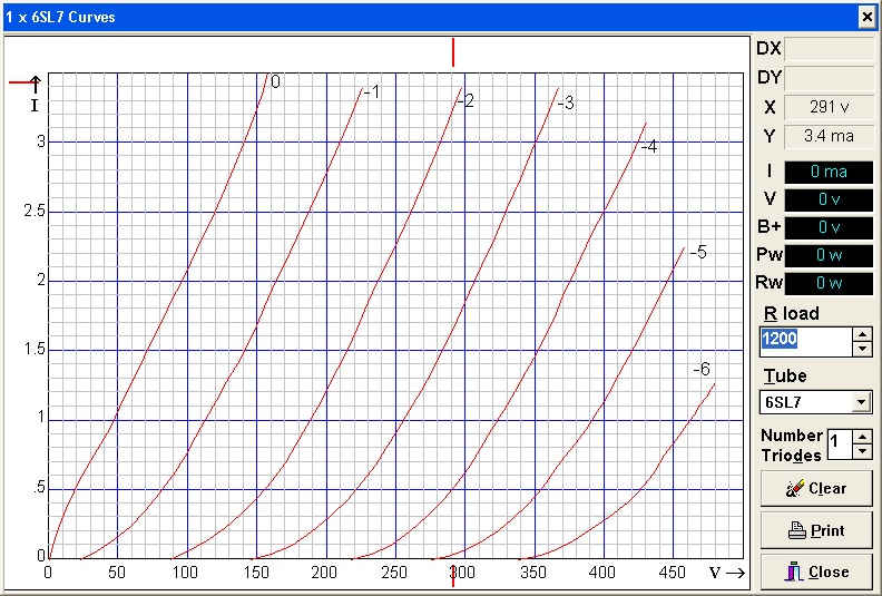 The 6SL7 is a nice sounding tube. The even spacing between the grid voltage curves is an indication of the tube's linearity. Each tube contains two identical triodes in a glass envelope with an octal (8-pin) base.