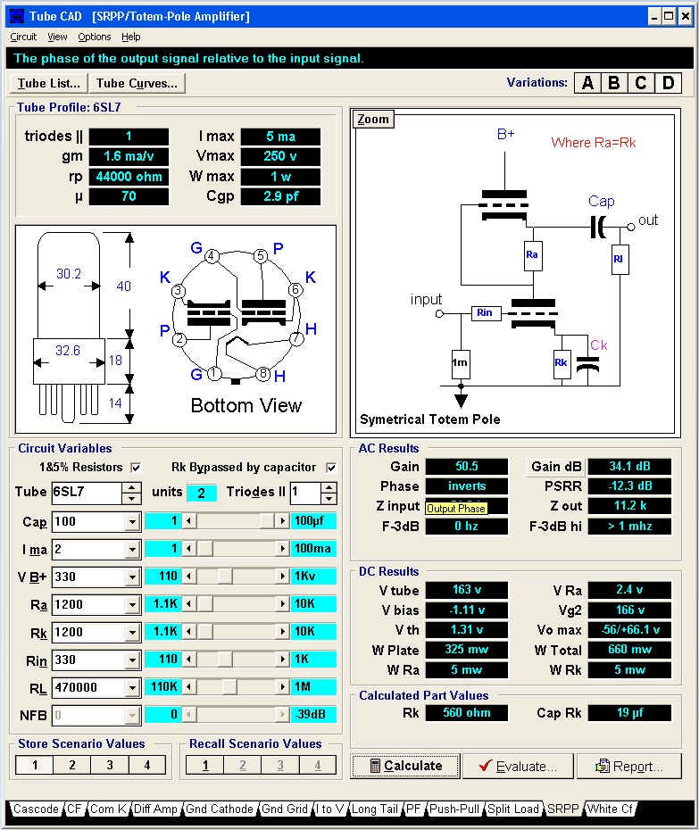 I used Tube CAD software to determine the best operating point for our 6SL7 SRPP input stage. After entering the parameters for the circuit, hit the Calculate button and the program crunches all the numbers.