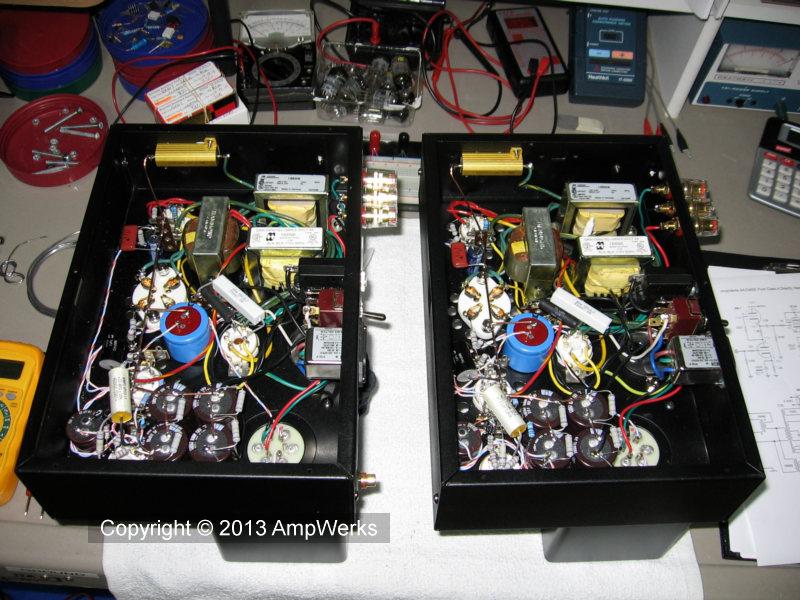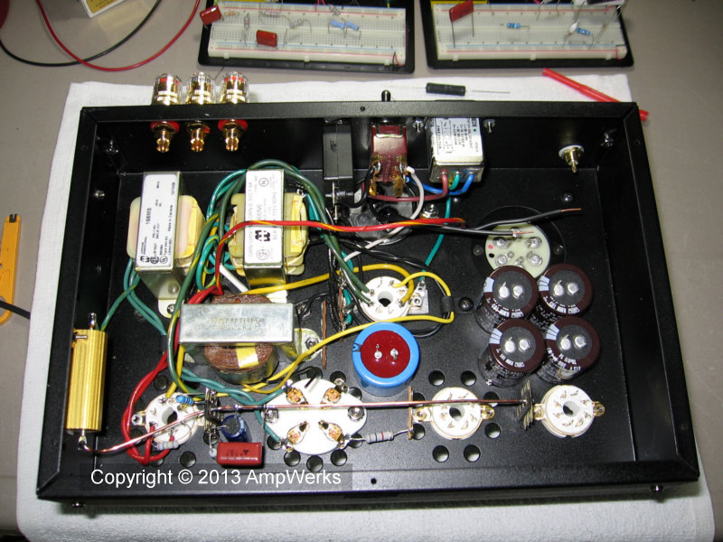 The wiring is almost complete in the photo below. Still to come are the polypropylene bypass capacitors and the neon pilot lights.